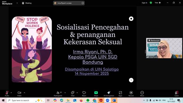 Kegiatan menghadirkan narasumber Irma Riyani, Ph.D., akademisi dan pakar gender dari UIN Sunan Gunung Djati (SGD) Bandung. Sosialisasi ini bertujuan untuk meningkatkan pemahaman sivitas akademika mengenai isu kekerasan seksual serta mekanisme pencegahan dan penanganannya di lingkungan kampus.