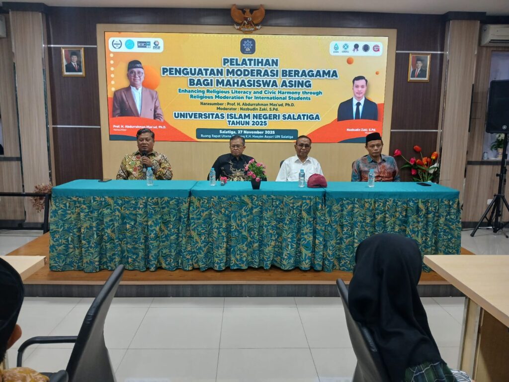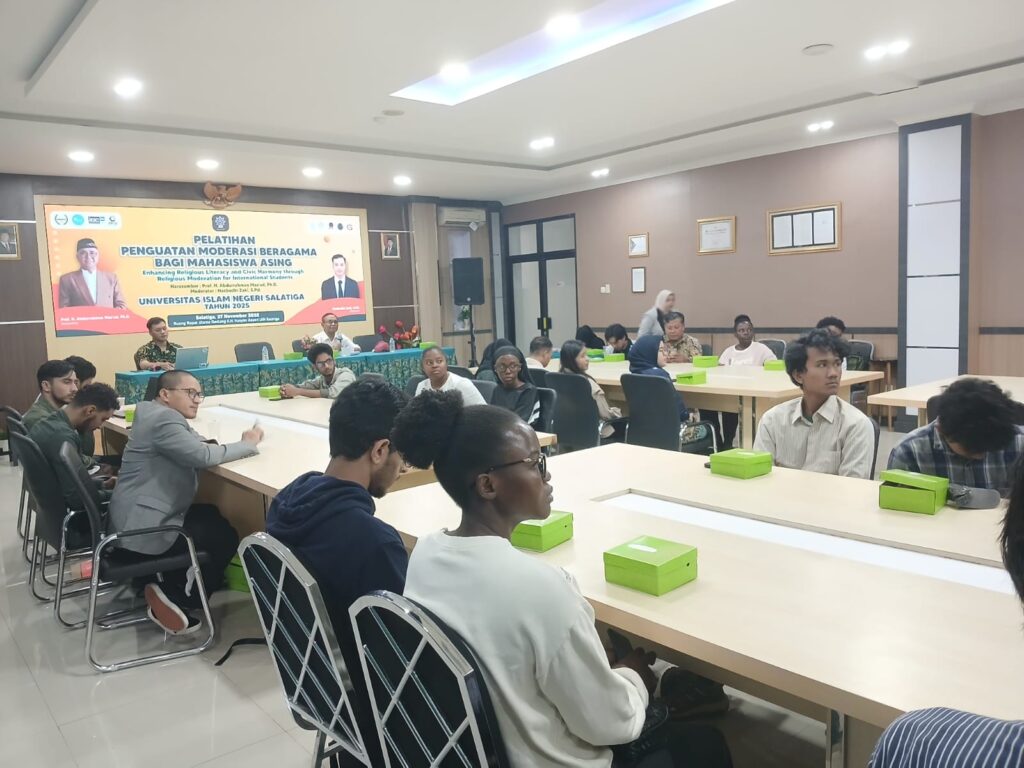 Salatiga — Pusat Wasathiyah Islam/Moderasi Beragama, Lembaga Penelitian dan Pengabdian kepada Masyarakat (LP2M) UIN Salatiga melaksanakan Pelatihan Penguatan Moderasi Beragama bagi Mahasiswa Asing pada Kamis, 27 November 2025, bertempat di Aula Lantai 1 Ruang Rapat Utama Gedung Rektorat UIN Salatiga. Kegiatan ini merupakan salah satu program strategis Kepala Pusat Wasathiyah Islam/Moderasi Beragama dalam memperkuat kapasitas keagamaan dan pemahaman lintas budaya bagi mahasiswa internasional.